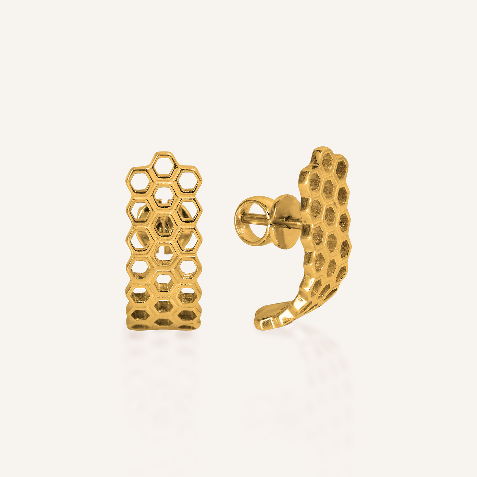 Архитектурные линии и лаконичная "J" форма серёг подчеркивает анатомическую красоту и скрывает несовершенства мочки уха. Серьги оснащены удобным замком-клипсой